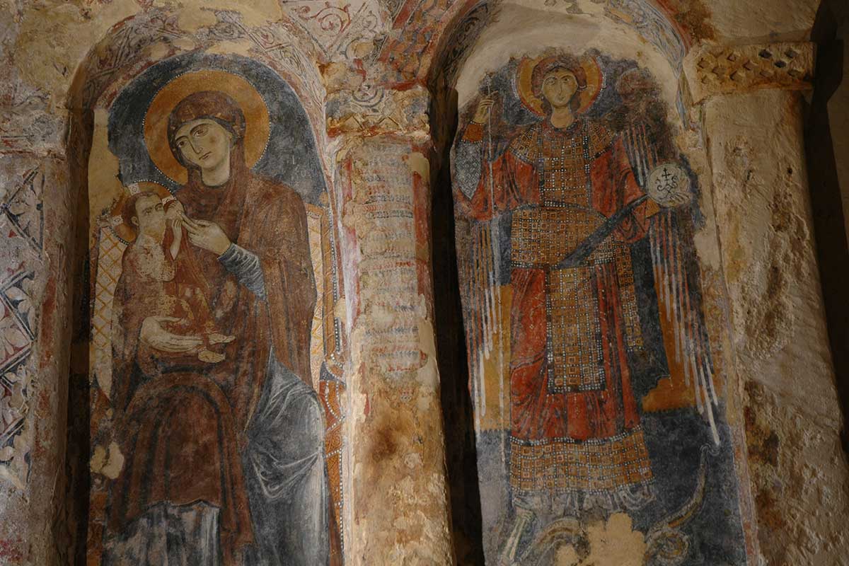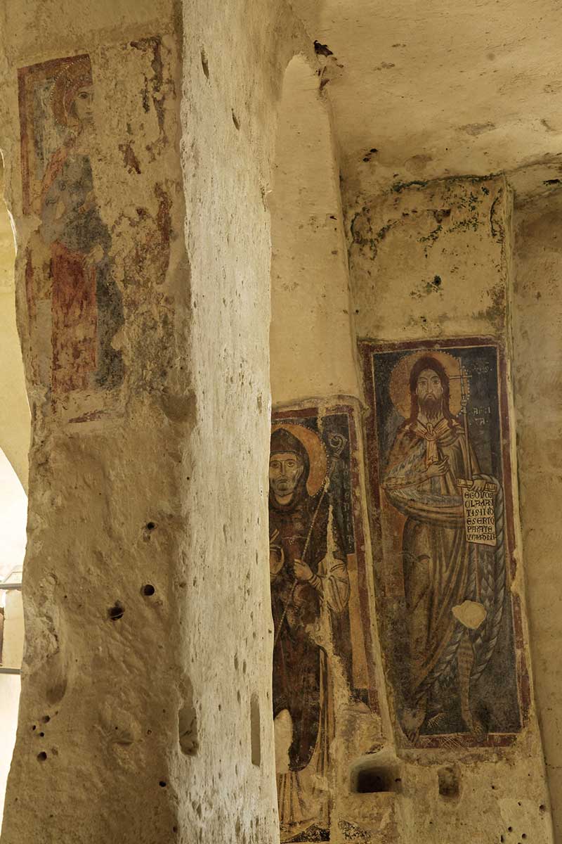 Racchiusi nel complesso testimonianza delle comunità monastiche a Matera, di particolare bellezza e importanza storico-artistica sono gli antichissimi affreschi che in parte decorano le pareti del complesso, tra tutti: La Madonna del Latte (1270) e, nella nicchia accanto, San Michele Arcangelo (1250), oltre a quello che per molti studiosi sarebbe San Gregorio (XIII sec.), per altri San Donato, e ancora San Benedetto – a testimonianza dell’origine benedettina del complesso – e Santa Scolastica, entrambi fondatori dei grandi ordini monastici del periodo.
