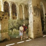 A destra del complesso, blocchi squadrati di tufo delineano l’entrata della chiesa, tutti terminano con un arco acuto che sul fondo, all’interno di una lunetta, contengono il simbolo liturgico di Santa Lucia. Delle tre esistenti, l’unica navata ancora accessibile, ingresso attuale della chiesa, è quella di destra, sempre rimasta aperta al culto.